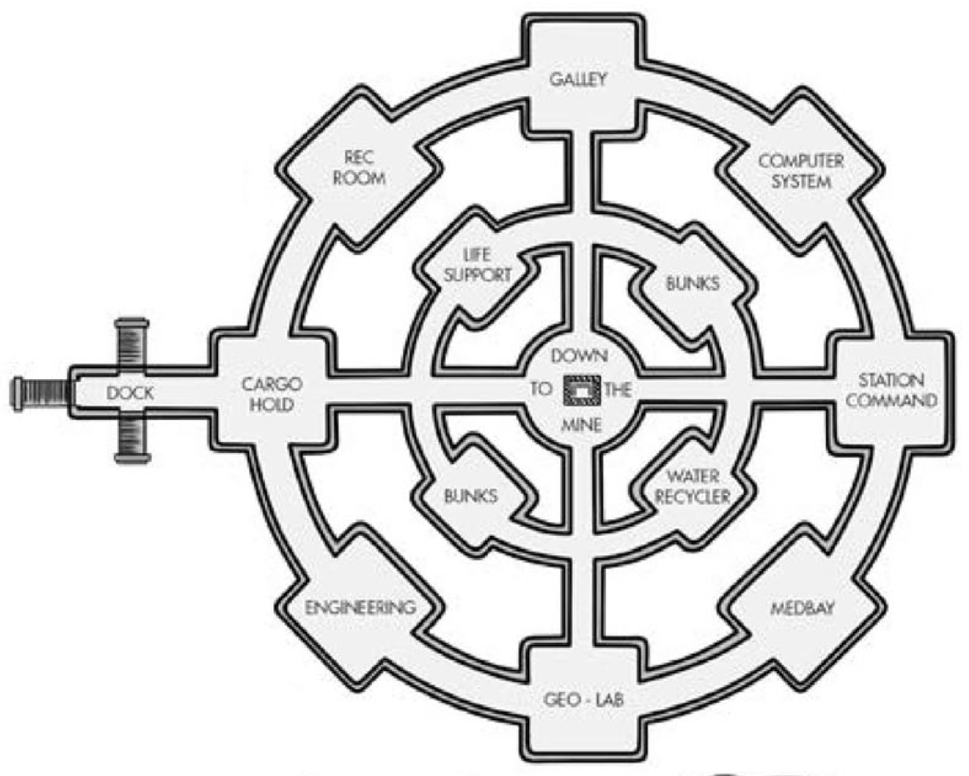 Ihr beschließt, ersteinmal eine Umrundung zu machen. Dabei entdeckt ihr an der “Unterseite” eine künstliche Öffnung. Eine Drohne, die ihr dort hineinschickt, verliert den Kontakt, aber ihr findet zumindest heraus, dass sich dort eine Höhle mit Gerät findet. Da ihr nicht das Risiko eingehen wollt, dort direkt mit Raumanzügen hineinzugehen, dockt ihr an der Station an. Ein erster Eindruck verrät euch, dass die Konstrukteure der Station eine andere Schrift verwenden als ihr. Dadurch könnt ihr nicht genau erkennen, wie die Atmosphäre hinter dem Schitt beschaffen ist. Also zieht ihr besser in Raumanzügen los.